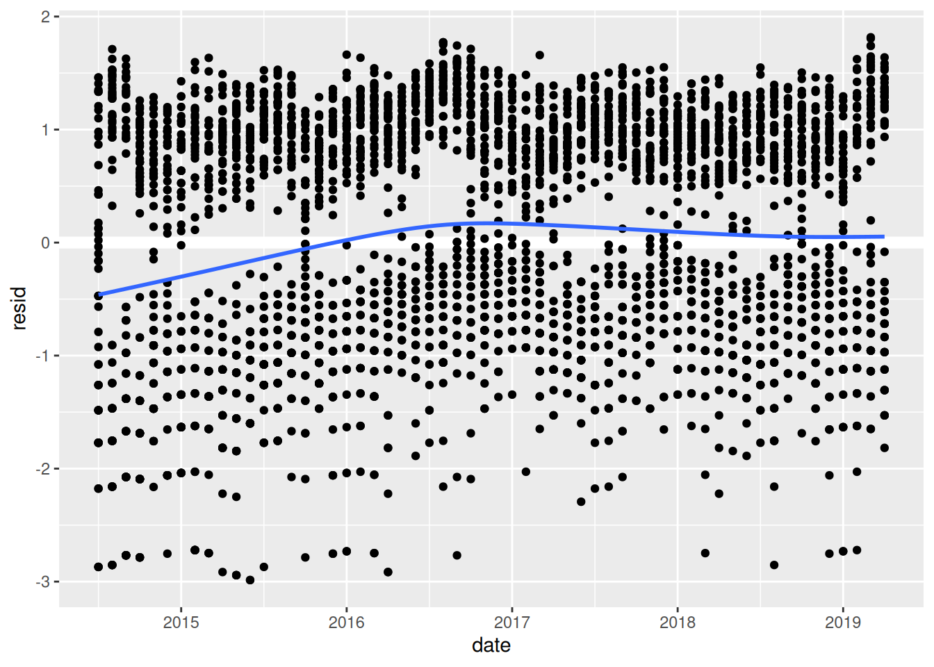 lsd_belmont %>%add_residuals(belmont_mod) %>%ggplot(aes(date, resid)) +geom_hline(yintercept =0, color ="white", size =3) +geom_point() +geom_smooth(se =FALSE)## Warning: Using `size` aesthetic for lines was deprecated in ggplot2 3.4.0.## ℹ Please use `linewidth` instead.## `geom_smooth()` using method = 'gam' and formula = 'y ~ s(x, bs = "cs")'