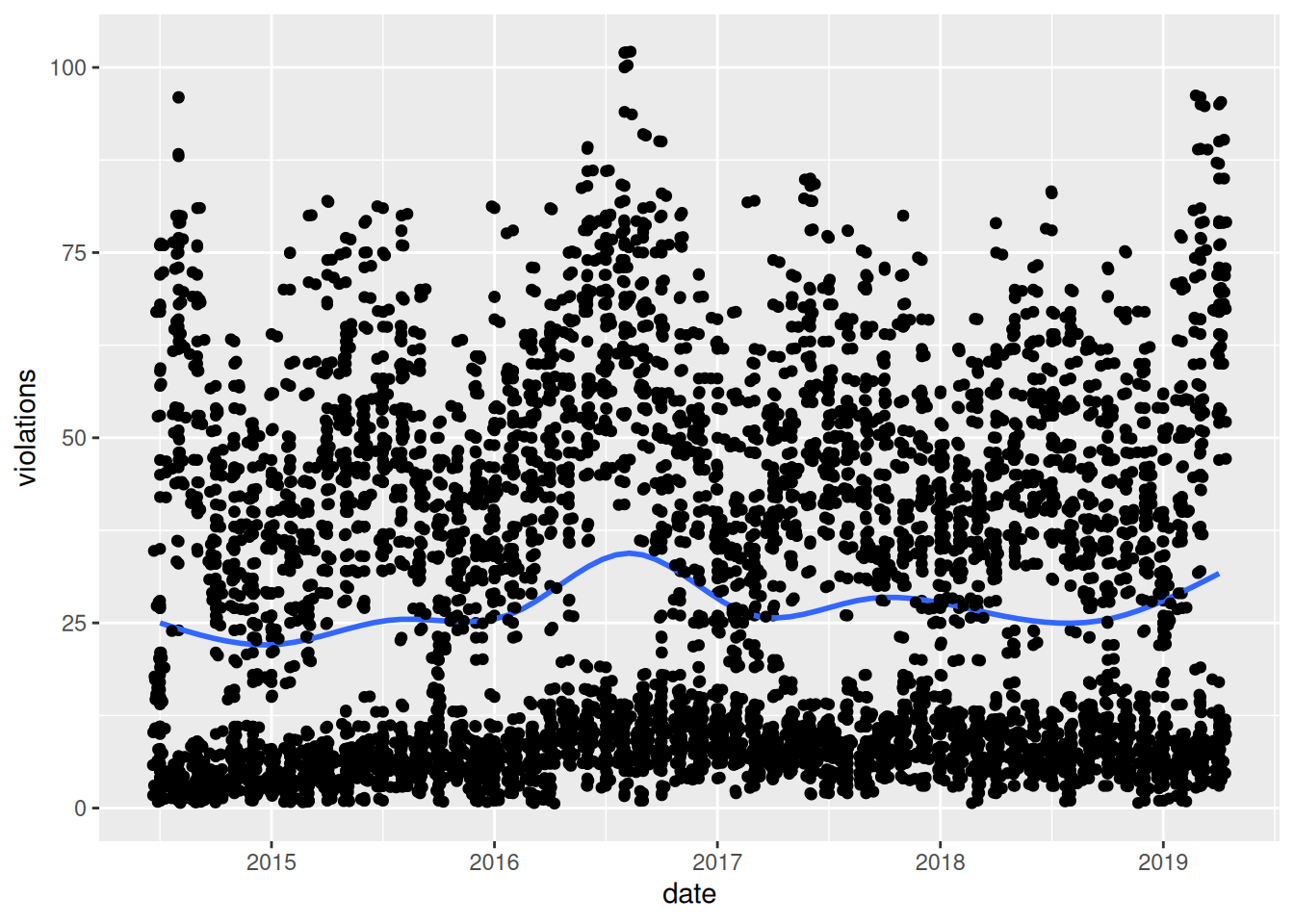lsd_belmont <- red_light_popular %>%filter(intersection =="LAKE SHORE DR AND BELMONT")ggplot(lsd_belmont, aes(date, violations)) +geom_point(aes(group = intersection)) +geom_smooth(se =FALSE) +geom_jitter()## `geom_smooth()` using method = 'gam' and formula = 'y ~ s(x, bs = "cs")'