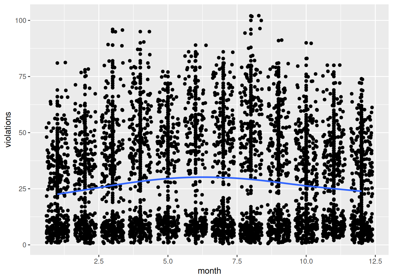 ggplot(lsd_belmont, aes(month, violations)) +geom_point(aes(group = year)) +geom_jitter() +geom_smooth(se =FALSE)## `geom_smooth()` using method = 'gam' and formula = 'y ~ s(x, bs = "cs")'